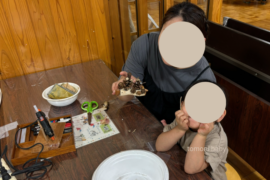 木の香りがただよう空間で、3歳児でも付き添いのもと楽しくクラフト体験ができました!